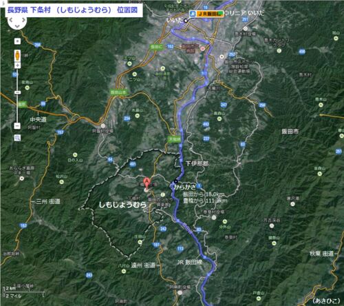 飯田 (いいだ)の みなみ 18キロの やまあいに、下条村 (しもじょうむら)って いう むらが ある。飯田からは みなみに 2本の 街道が いっとるだけど、ひとつが 豊田 (とよだ)の ほうに いく 三州 街道で、まあ ひとつが 東栄町 (とうえいちょう)の ほ…