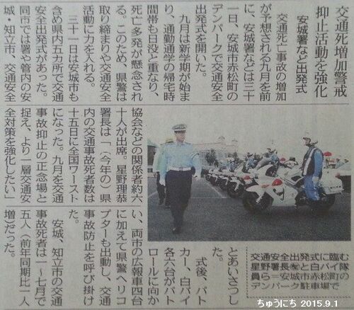 おぼんの8月15日から都道府県別で交通事故死者数がいちばんおおい県になっちゃった愛知県。こいじゃあいかん!ってことで、2015年8月31日、あんじょう警察署がデンパークで交通安全出発式をひらいた。 △ デンパークで交通安全出発式 - ちゅうにち 2015.9.1 …