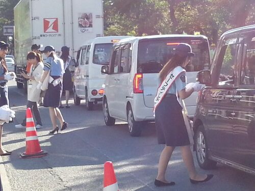 あきの交通安全期間中の2015年9月29日、あんじょう市役所まえの県道で交通事故なしキャンペーンがあった。ドライバーのひとたちにあんじょう特産のなしをくばって、これで事故なしね♪って寸法だ。 ◇ ◇ 集合! さいしょにあんじょう市長、あんじょう警察署長…